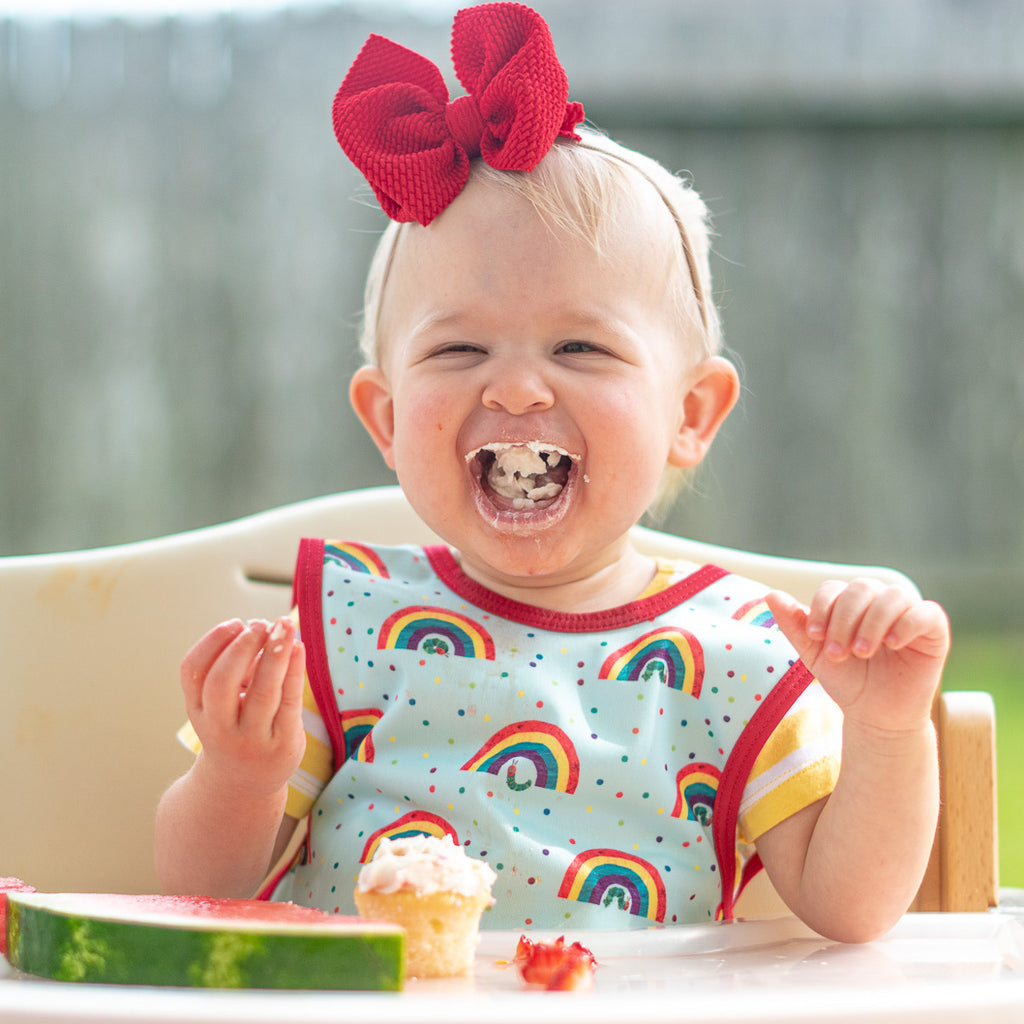 Our unique design allows your child to play freely with their food or sensory activities without constricting around their neck like a traditional bib and your tiny tot can't remove it without a grown-up. Less mess for everyone! (It rinses clean in the sink between meals as well, saving you headache and laundry.)