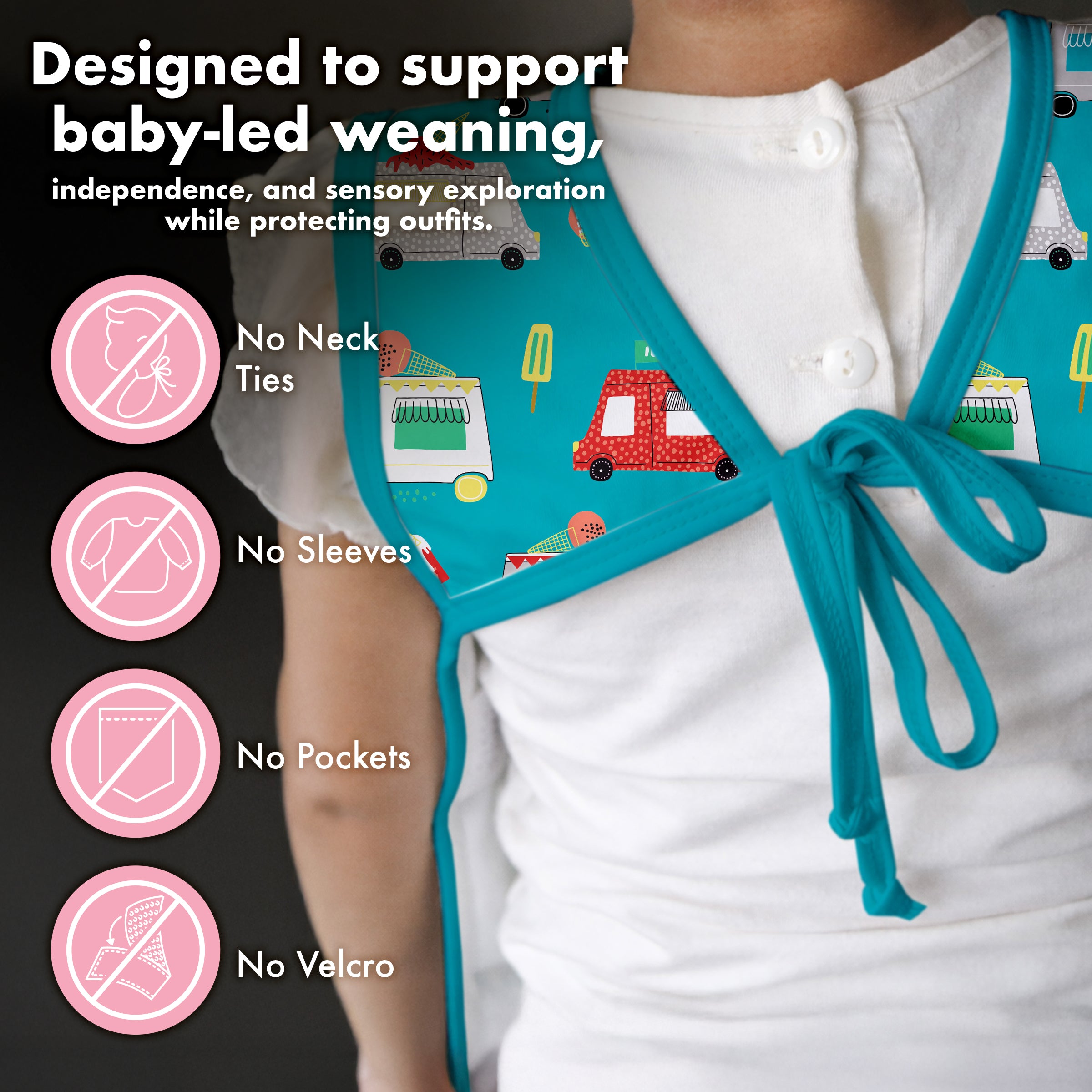 Full Coverage Protection Thoughtfully designed to cover more than traditional bibs, protecting laps, sides, and outfits underneath.