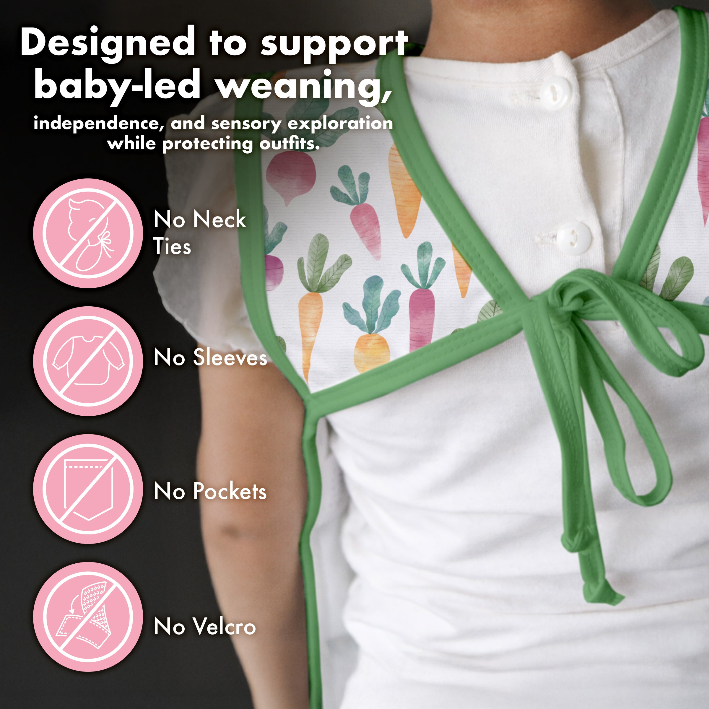 Thoughtfully designed to cover more than traditional bibs, protecting laps, sides, and outfits underneath.